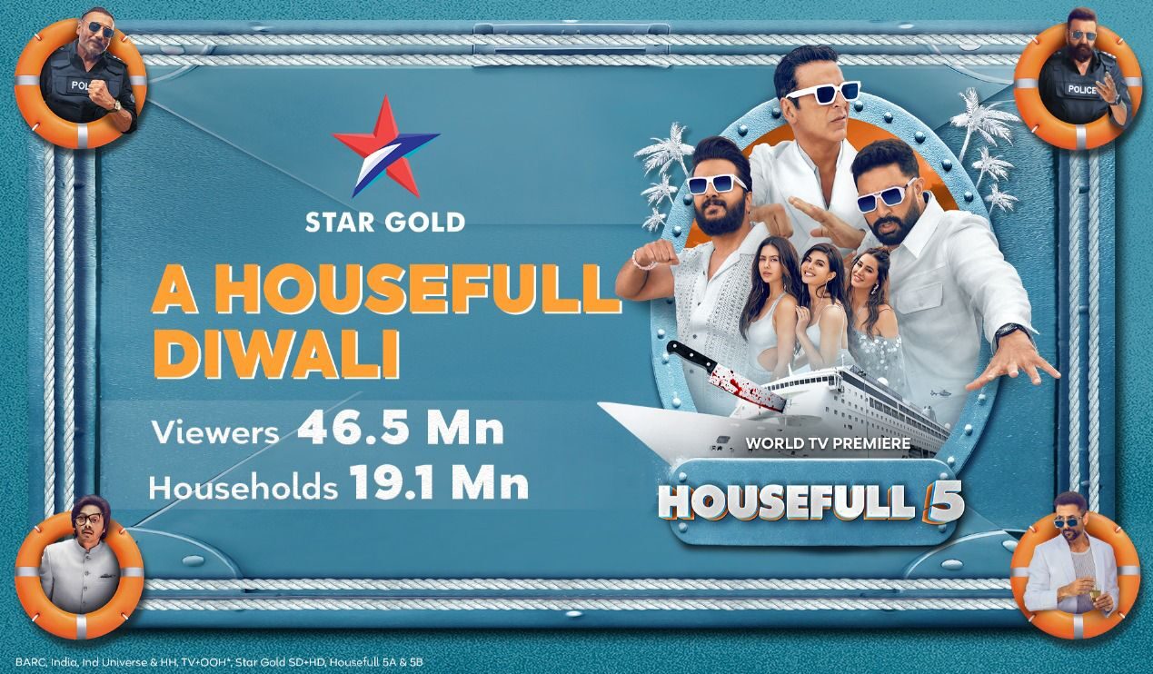 बॉक्स ऑफिस के बाद हाउसफुल 5 ने टीवी पर भी इतिहास रच दिया। स्टार गोल्ड पर हुए इसके वर्ल्ड टीवी प्रीमियर को 4.65 करोड़ दर्शकों और 1.91 करोड़ घरों ने देखा। दो अलग क्लाइमेक्स – हाउसफुल 5ए और 5बी का अनोखा प्रयोग दर्शकों को खूब भाया। इस व्यूअरशिप के साथ यह अक्षय कुमार की साल की सबसे बड़ी टीवी रिलीज़ बन गई।